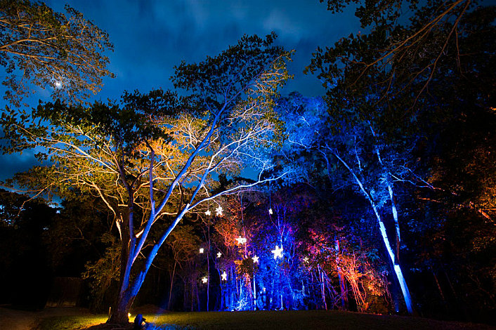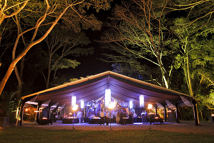 A completely intimate, natural experience set within the candle lit rainforest under a black silk canopy highlighted by crystal and bud light chandeliers, Flames of the Forest creaeted and unforgettable memory at an extraordinary natural venue.